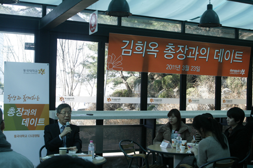 With laughing all around, the first date with president Hee-ok Kim ended with great success. This was the first official meeting held on campus. The meeting took place in Rose Bud cafe with some lucky students who were chosen through a lottery system and some selected from the school faculties.
