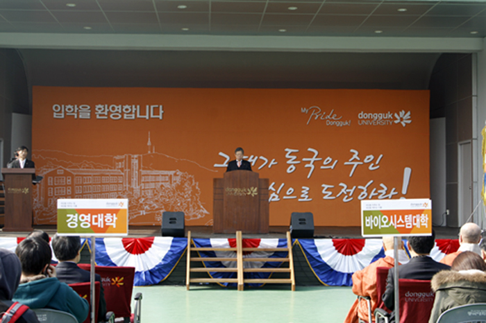 | ▲ Entrance ceremony for new comers was held at Manhae Plaza on February 26th, at 11 A.M. On the day, about 3,100 students, excluding foreign students became the new members of Dongguk. President Kim Hee-ok gave a welcoming speech and encouraged the students to challenge themselves. / Photograph by Na Soo-hyun | ||