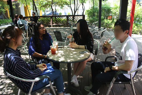 Shreya: I had two girls and Chan-woong in my group. All four of us did not wanted to have a teacher-student relationship but have a friend-friend relationship. So, instead of sitting in the class studying, we decided to go out and have coffee or dinner together, which was obviously more enthusiastic. To be specific, on Tuesdays, we had dinner and had a conversation for about three hours. On Wednesdays, we met at a café near school. We talked about random topics such as college life, movies, and books. Basically that was our study style. We always kept it really flexible and friendly.