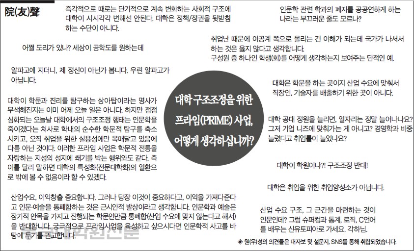 - 대학이 학문과 진리를 탐구하는 상아탑이라는 명사가 무색해진지는 이미 어제 오늘 일은 아니다. 하지만 점점 심화되는 오늘날 대학에서의 구조조정 행태는 인문학을 죽이겠다는 처사로 학내의 순수한 학문적 탐구를 축소시키고, 오직 취업을 위한 실용성에만 목매달고 있음에 다름 아닌 것이다. 이러한 프라임 사업은 학문적 전통을 자랑하는 지성의 성지에 쐐기를 박는 행위와도 같다. 즉 이를 달리 말하면 대학의 특성화(전문대학화)의 일환으로 밖에 볼 수 없음이라 할 수 있겠다.