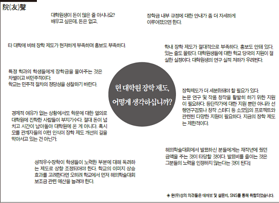 - 학내 장학 제도가 절대적으로 부족하다. 홍보도 안돼 있다. 있는 줄도 몰랐다. 대학원생들에 대한 학교 당국의 지원이 절실한 실정이다. 대학원생의 연구 실적 저하가 우려된다.