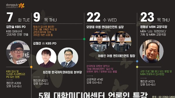 A special lecture by media/broadcasters will be held in May organized by Dongguk University's Media Center. Following a special lecture held in March, the University Media Center held a special lecture for journalists and broadcasters in May.