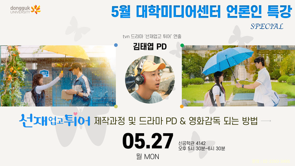 Do you know the drama <선재 업고 튀어>, which has recently captivated Korea? This drama has captured the hearts of people across all ages. Producer Kim Tae-yeop, who oversees directing this work, will come to our school to give a special lecture. This special lecture is scheduled for May 27th at 5:30 P.M. It offers a valuable opportunity to gain insights into the drama production process and learn about the path to becoming a successful drama producer or film director. In addition, Producer Kim will share the vivid behind-the-scenes stories from <선재 업고 튀어>, providing a deeper understanding of the creative journey behind the drama.