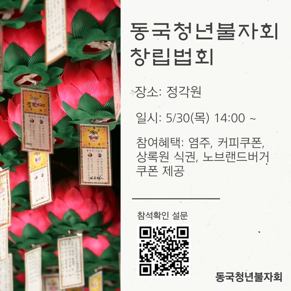 동국청년불자회 설립을 기념하는 창립식은 우리대학 정각원에서 진행된다. 입회를 원하는 원우는 현장에 방문해서 바로 가입한 뒤, 창립식에 참여할 수 있다. 동국청년불자회 창립 법회에 참여를 원하는 원우는 구글폼(https://url.kr/9szrvj)을 작성해 제출하거나, 동국청년불자회 회장 류용현(010-2531-3834)에게 유선상으로 참석 여부를 알리면 된다. 창립법회는 30일 14시부터 약 1시간 동안 진행되며, 참여시 염주, 커피 쿠폰, 상록원 식권, 노브랜드 버거 쿠폰 등 다양한 혜택이 제공된다.