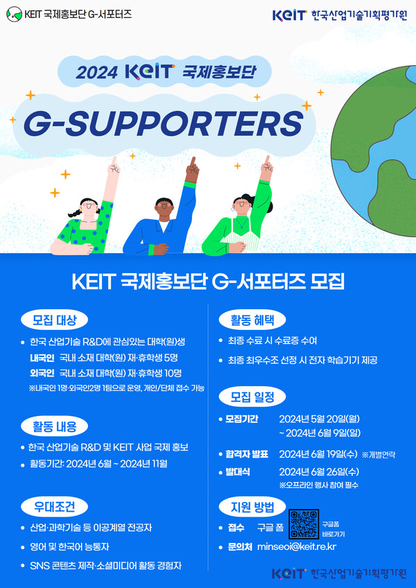 The Korea Planning & Evaluation Institute of Industrial Technology is recruiting global promotional supporters. The Korea Institute of Industrial Technology Planning and Evaluation is an industrial technology R&D specialized institution under the Ministry of Trade, Industry and Energy, and is recruiting G-supporters to promote the international promotion of Korean technology R&D to Korean and foreign students who are currently on a leave of absence at domestic universities.