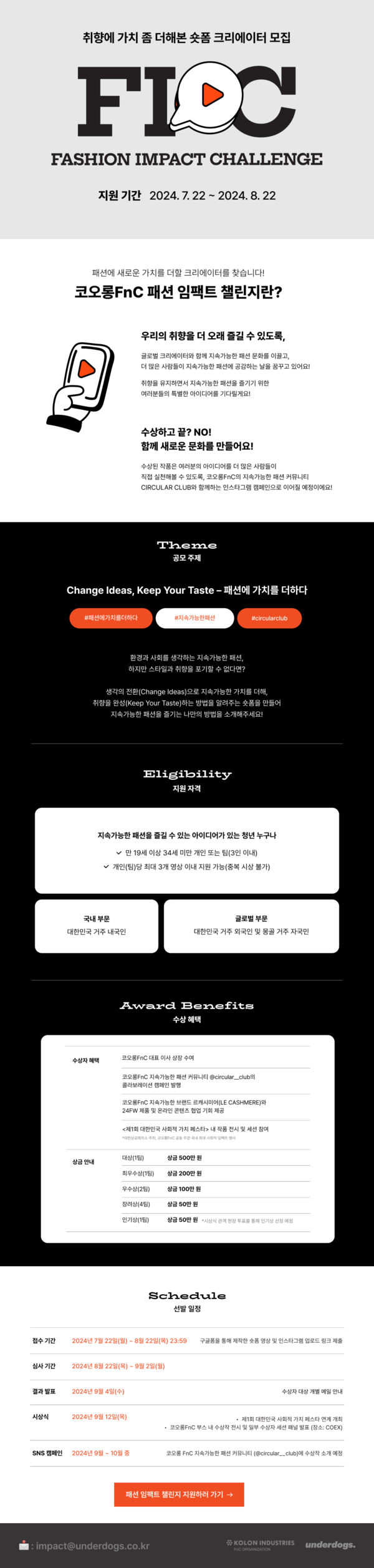 They are accepting applications until midnight on August 22nd. Individuals aged 19 and older, under 34, or teams of no more than three people can participate. It is divided into the domestic and global sectors, and foreigners residing in Korea and Mongolians residing in Mongolia can participate in the global sector. If you are interested in the Kolon FnC Fashion Impact Challenge under the theme of "Change ideas, Keep your Taste," please refer to the following link : https://kolonimpact2.imweb.me/