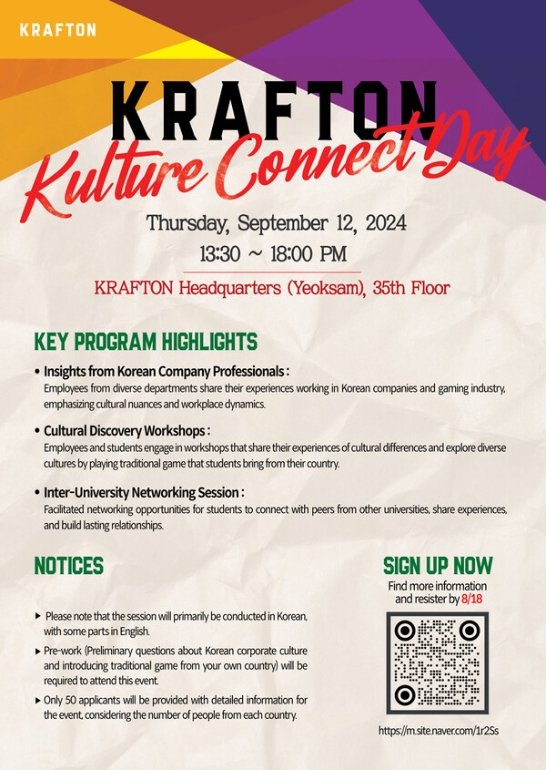 Interested international students can apply through an online survey by August 25. For more information or inquiries, please contact the event coordinator at gino@krafton.com.