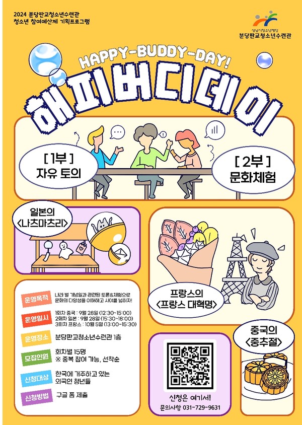 It is recruited from foreign nationals aged 19 to 29 living in Korea. The recruitment period for participants in the "Happy Buddy Day!" program is until Monday, September, 23rd. Then, wired confirmation will be conducted after completing and submitting an online application. It is a program consisting of three sessions, and 15 participants are recruited for each session. Moreover, duplicate applications for each session are possible. This program will be held at Bundang Pangyo Youth Center.