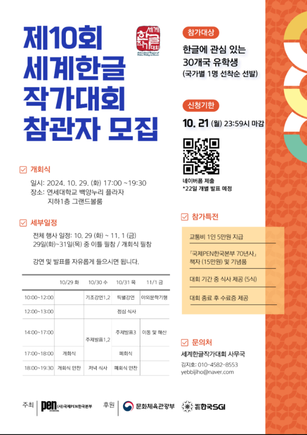Participants will be offered a 50,000 won transportation fee and meals during the competition, as well as brochures, souvenirs, and certificates of completion after the competition ends. Those who have more questions or need inquiries should contact the Secretariat of the 10th International Congress of Writers Writing in Korea at 010-4582-8553.