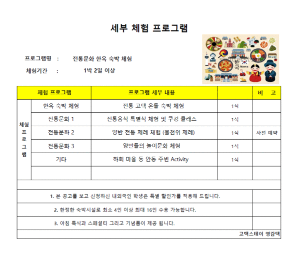 Students who apply after seeing this announcement will receive a special discount, and all participants in the program will be provided with a special breakfast, specials, and souvenirs. The accommodation program will be conducted in teams of at least 4 people. Students who wish to experience traditional Korean culture are encouraged to apply using the contact information above.