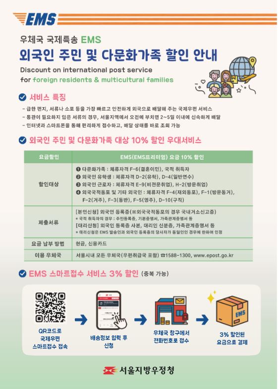 10% discount applies to international express mail (EMS) shipments for foreign residents and multicultural families. Eligible recipients include F-6 (marriage immigrants), D-2 (international students), D-4 (general trainees), E-9 (non-professional workers), H-2 (visiting workers), F-4 (overseas Koreans), F-1 (visiting and cohabitation), F-2 (residents), F-3 (dependents), F-5 (permanent residents), D-10 (job seekers), and other foreign nationals.