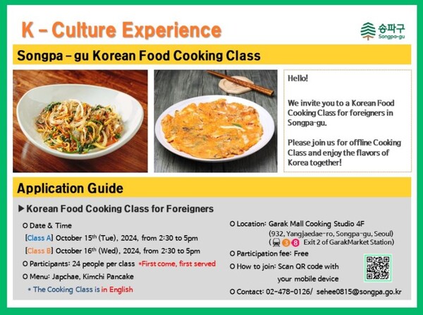 Participation is free, and registration can be completed by scanning the QR code on the poster or information sheet to fill out the Google Form application. For more details, please contact the Songpa District Tourism Promotion at 02-2147-2112 or via email at sehee0815@songpa.go.kr.