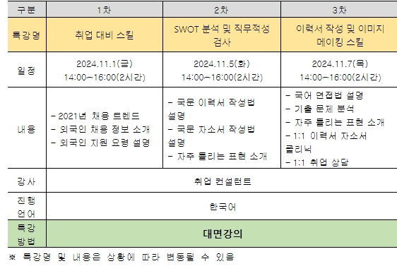 The third round will take place on Thursday, November 7. Under the title of Resume Creation and Image Making Skills, it includes explanations of Korean interview methods, analysis of previous questions, a one-to-one resume cover letter clinic, and one-to-one job counseling.