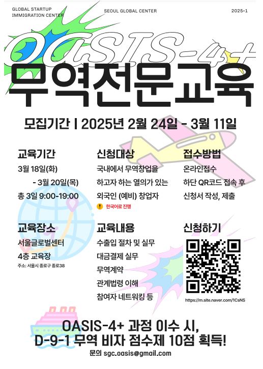 The Seoul Global Center is offering the OASIS-4+ trade professional training course. The application period is from February 24th to March 11th, and the training will take place from March 18th to March 20th, lasting for three days, from 9 A.M. to 7 P.M. each day. This course is aimed at foreign nationals who are interested in starting a trade business in Korea, and the training will be conducted in Korean. To apply, participants should submit an online application through the QR code provided. The training will be held at the 4th floor training room of the Seoul Global Center, located at 38 Jongno, Jongno-gu, Seoul. The course content includes export/import procedures, payment practices, trade contracts, understanding relevant laws, and participant networking. Upon completion of the OASIS-4+ course, participants will earn 10 points towards the D-9-1 trade visa score system. For inquiries, please contact sgc.oasis@gmail.com.