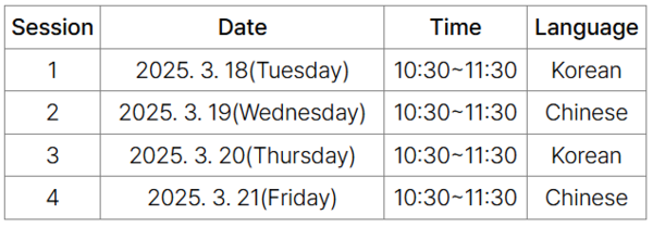 A total of four sessions will be held, with two sessions conducted in Korean and two sessions conducted in Chinese. Students may choose any one of these sessions based on their language preference.