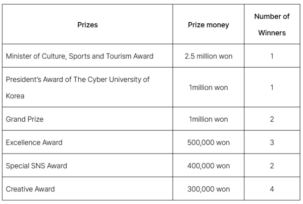 Interested participants must complete and submit the online application form by scanning the provided QR code. The submission deadline is Sunday, April 27th. Winners will be announced on Wednesday, May 14th, through The Korea Times (print and online editions) and on the Howdy Korea YouTube channel. The awards ceremony is tentatively scheduled for Thursday, May 29th. Winners residing overseas will have the option to participate online. Detailed information on the prizes and further contest guidelines are available on the official Korea Times website. Please refer to the table below for detailed information on prizes.