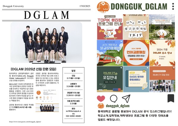 Applicants must be enrolled students (undergraduate or graduate) at Dongguk University who are able to participate during the 2025 Spring semester. They should also have an active social media account (YouTube, Instagram, etc.) that they can utilize for activities. Those with prior experience in promotional activities for other institutions, as well as skills in video shooting, Photoshop, and submitting a video portfolio, will be given preference.