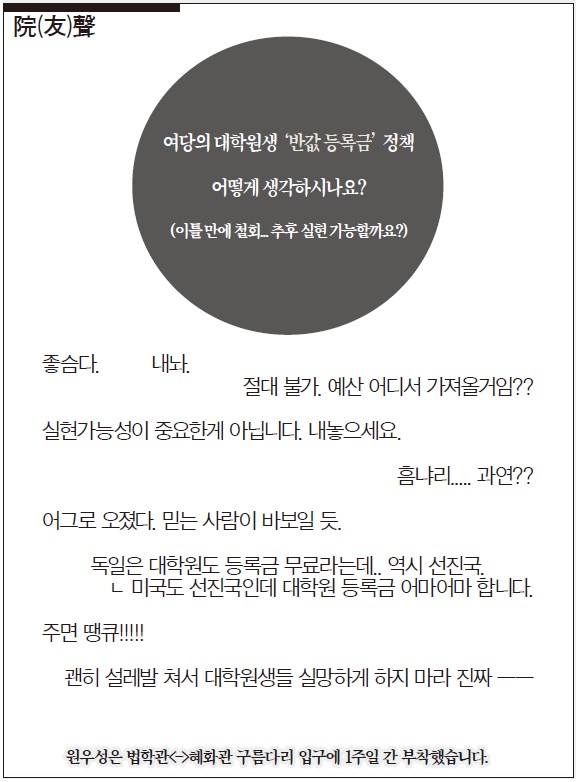 좋아요0훈훈해요0슬퍼요0화나요0후속기사 원해요0 동국대학원신문 dgugspress@dgu.edu 다른기사 보기 저작권자 © 동국대학교 대학미디어센터 무단전재 및 재배포 금지 당신만 안 본 뉴스 [포토뉴스] 종문사, 사과대 불교동아리 '템플애플'에 장학증서 수여 [사회] 열악한 비정규직 현실, 청년 노동권의 현주소 [졸업생 인터뷰] 봤으니까, 뒤로 돌아갈 수 없는. 정재율 시인 본사사령 [東심東락] QR 주문 서비스 개발팀 ‘D-order’ [체험르포] 동악을 비추는 손길, 청소노동자의 하루 [대학기획] 등굣길 위 불편한 도로 사정, 인쇄업계와의 어색한 공존 헤드라인 뉴스 [포토뉴스] 종문사, 사과대 불교동아리 '템플애플'에 장학증서 수여 주요기사 [현장東행] 잊지 않기 위한 걸음으로, 동국인 등산대회 [보도] 열한 번째 봄, 그날에 멈춰 선 마음들 [포토뉴스] 총학생회 ‘동백’ 1학기 중간고사 간식행사 진행 [東심東락] 텍스트로 전하는 환상성의 세계, 국어국문문예창작학부 장르문학분과 [보도] 발걸음 끊긴 옥상 공원 [보도] 불편한 nDRIMS... 새 앱 준비하고 있었다