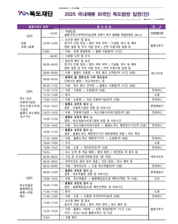 All costs related to transportation, accommodation, meals, and admission will be fully covered by the Dokdo Foundation. Those interested in participating are encouraged to express their intent by emailing skfk017@dongguk.edu. For a detailed itinerary, please refer to the schedule image provided.
