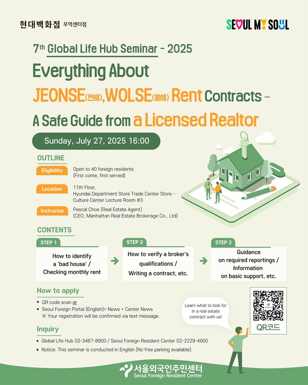 Titled “Everything About JEONSE, WOLSE Rent Contracts – A Safe Guide from a Licensed Realtor,” the seminar aims to help foreign residents better understand Korea’s unique rental systems, JEONSE and WOLSE. It is designed especially for those who are navigating the housing market for the first time. The seminar will be led by Pascal Choe, a licensed real estate agent and CEO of Manhattan Real Estate Brokerage Co., Ltd.