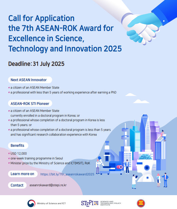 Each awardee will receive a certificate from the Minister of Science and ICT of the Republic of Korea, a cash prize of USD 12,000, and an invitation to the ASEAN-ROK STI Training Program, which includes full coverage of travel and accommodation expenses. Applications must be submitted by email no later than Thursday, July 31, 2025. For detailed guidelines and application forms, please refer to the official link at https://bit.ly/7th_aseanrokaward2025. For inquiries or to submit your application, please contact aseanrokaward@stepi.re.kr.