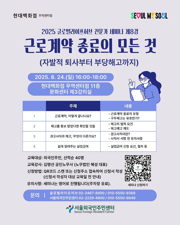 The Global Life Hub will host the 8th session of its 2025 Expert Seminar Series, titled “Everything About Termination of Employment Contracts: From Voluntary Resignation to Unfair Dismissal,” on Sunday, August 24th, 2025, from 4 P.M. to 6 P.M. at Lecture Room 3, 11th floor, Hyundai Department Store Trade Center Cultural Center.