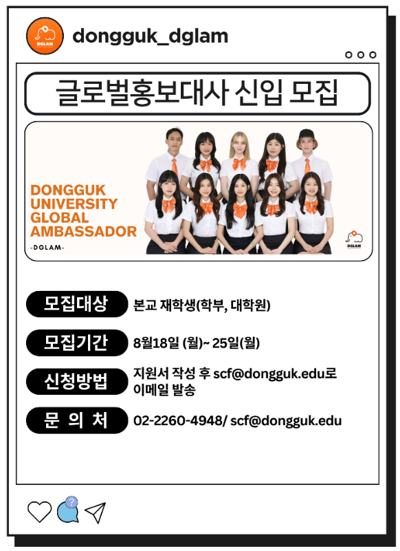 Dongguk University has announced the recruitment of the Dongguk Global Ambassador (DGLAM) program for the Fall semester of the 2025 academic year. The ambassadors will provide admission information to international students and contribute to promoting the university’s image both domestically and abroad. The deadline for application submission is August 25th, 2025.