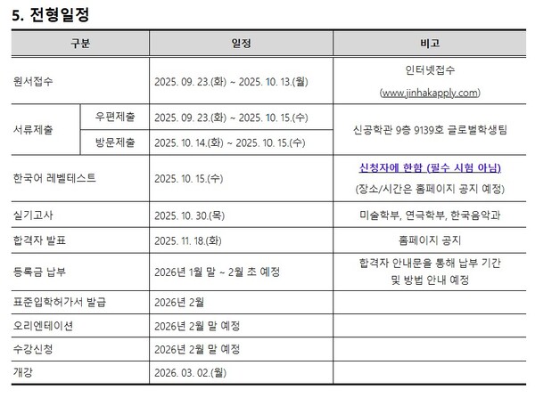 The Korean Language Placement Test will be held on Wednesday, October 15th, 2025, but only for applicants who register for it. It is not a mandatory test, and the exact time and location will be announced on the university website. The practical examination will take place on Thursday, October 30th, 2025, and will be required for applicants to the College of Fine Arts, the Department of Theatre, and the Department of Korean Traditional Music. The results of admission will be announced on Tuesday, November 18th, 2025, on the university website.