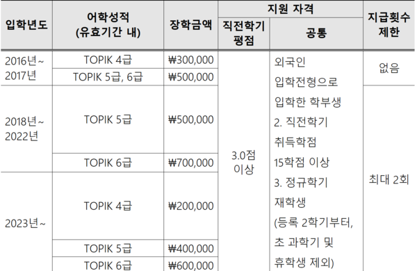 For students admitted from 2023 onward, the scholarship amounts are 200,000 Korean won for TOPIK Level 4, 400,000 Korean won for TOPIK Level 5, and 600,000 Korean won for TOPIK Level 6. Applicants must meet the same requirements regarding GPA, credit completion, and regular enrollment; those exceeding the standard study period or on leave of absence are not eligible. The scholarship can be awarded a maximum of two times.