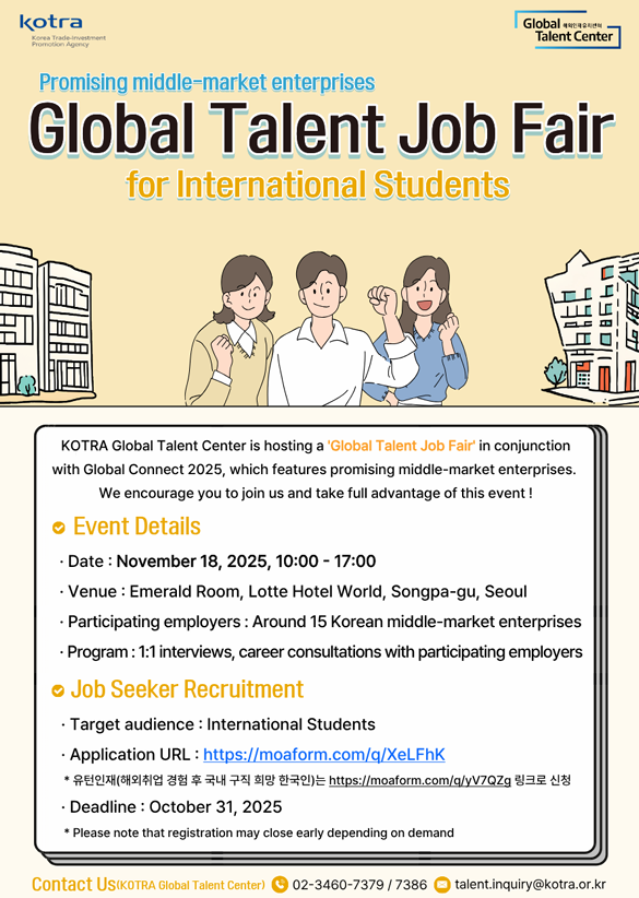 KOTRA’s Global Talent Center will hold the “Global Talent Job Fair” in conjunction with Global Connect 2025 for international students. This event will feature promising Korean middle-market enterprises and provide opportunities for recruitment and career consultations. It will take place on November 18th, 2025, from 10 A.M. to 5 P.M. at the Emerald Room, Lotte Hotel World in Songpa-gu, Seoul. About 15 Korean middle-market companies will participate, offering one-on-one interviews and career counseling sessions.