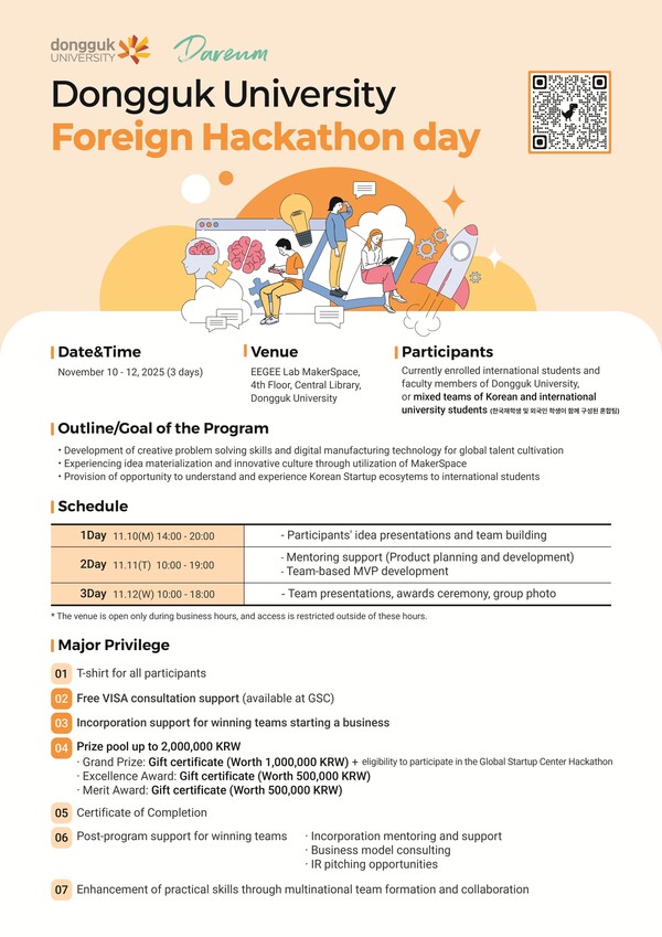 The hackathon welcomes currently enrolled international students and faculty members of Dongguk University, as well as mixed teams of Korean and international university students. Participants will work together to experience idea materialization and innovative culture using the MakerSpace, while also gaining opportunities to understand and experience the Korean startup ecosystem.